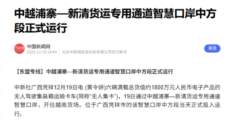 12月19日,备受瞩目的中越浦寨-新青货运专用通道智慧口岸中方段正式投入运营,这标志着中越边境贸易物流迎来智能化升级的关键里程碑,将显著提升跨境货物的通关效率和便利化水平。