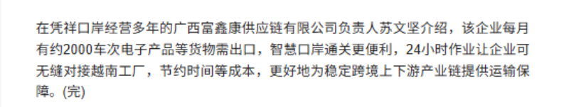 我司广西凭祥负责人苏文坚受访时表示:“我们深感荣幸能参与到这项具有重要战略意义的智慧口岸建设项目中。在试运行期间,共同验证了其在提升口岸车辆周转效率、优化通关作业流程、保障货物运输时效性与准确性等方面的显著成效。智慧口岸的数字化赋能,不仅惠及富联康等同类企业的跨境业务,更将为中国—东盟产业链供应链协同注入新活力。”
