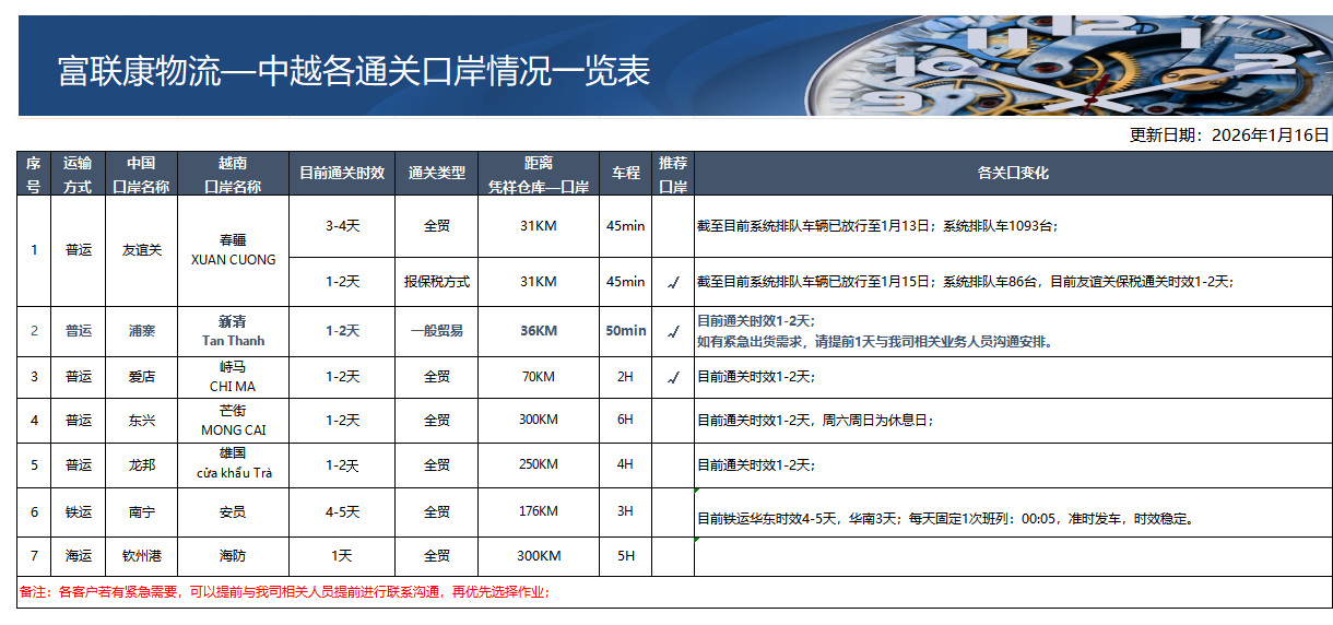富联康物流-中越各通关口岸情况一览表1月16日